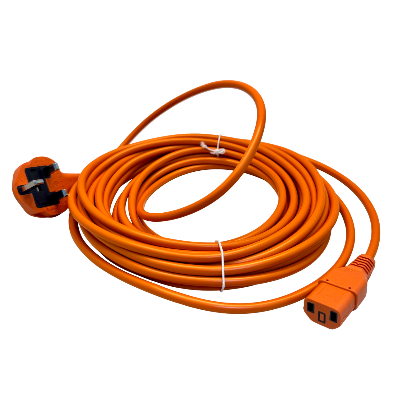 This is a 10-metre, high-visibility orange power cable with a UK 3-pin plug on one end and a straight IEC C17 (2-hole) female connector on the other.