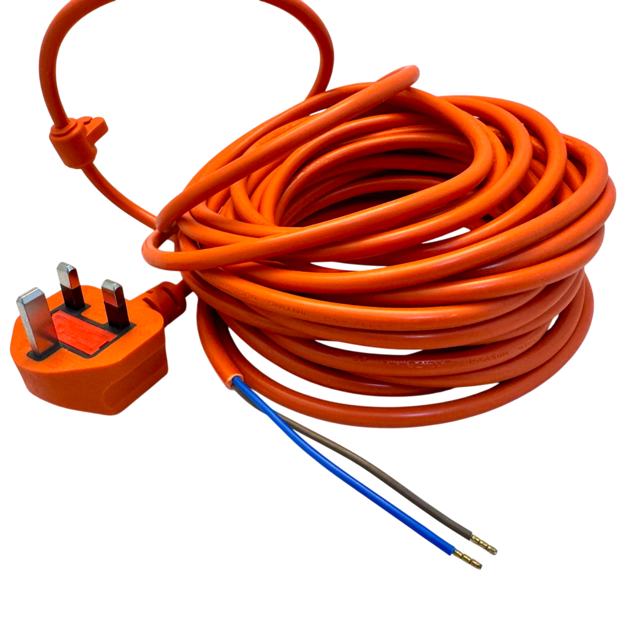 A practical, high-visibility 10m orange 2-core power flex for general electrical repairs and replacements. It includes a moulded UK plug, a rubber cable-tidy clip and free ends ready for fitting.
